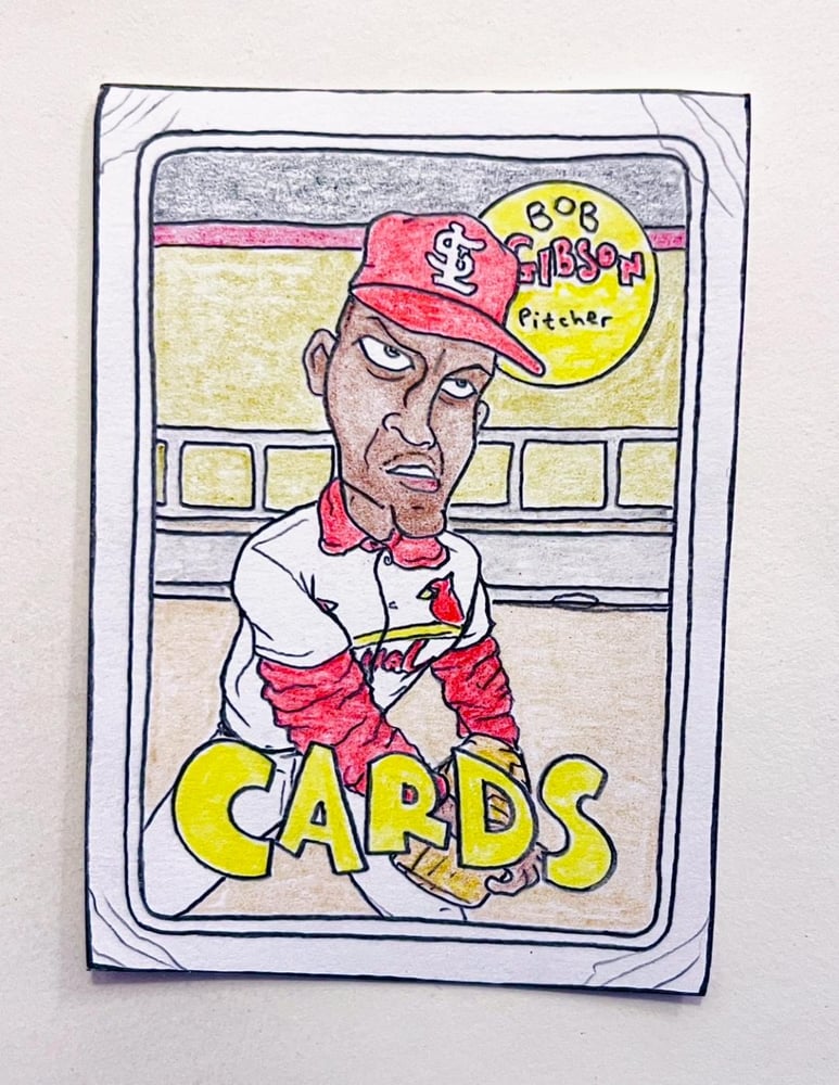 Original trading card artwork, drawn in colored pencil on light cardstock. Back of the card has a "Gummy Arts" stamp and artist signature.